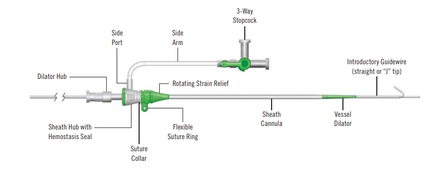 Contents: Introducer Sheath with Hemostasis Valve, Sideport, Dilator, and 80 cm Double Distal Guidewire with “J” and Straight Tips (10 units per box)