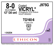 - Ethicon J576G COATED VICRYL® (polyglactin 910) Suture, MICROPOINT - Spatula, Absorbable, TG160-8 5.5mm / TG160-8 ½ Circle, Violet Braided 12" ˜ 30cm, Size: 7-0, Box of 12