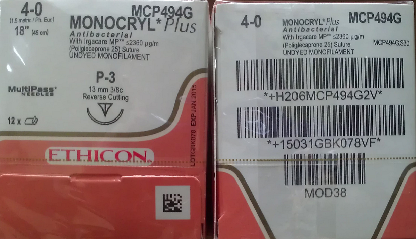 - Ethicon MCP494G MONOCRYL® Plus Antibacterial (poliglecaprone 25) Suture, Precision Point - Reverse Cutting, Absorbable, P-3 13mm 3/8 Circle, Undyed Monofilament 18" = 45cm, Size: 4-0, Box of 12