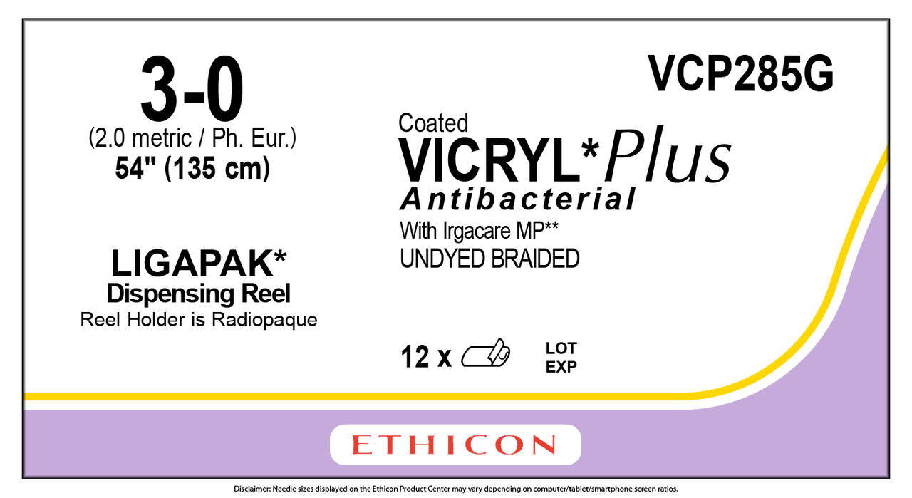 - Ethicon VCP285G COATED VICRYL® Plus Antibacterial (polyglactin 910) Suture, LIGAPAK Ligating Reel, Absorbable, Undyed Braided 54" = 135cm, Size: 3-0, Box of 12