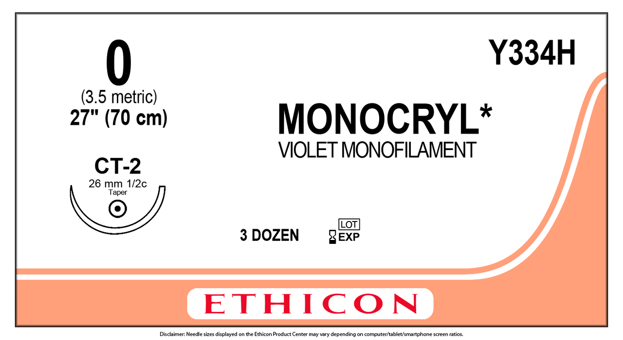 - Ethicon Y334H MONOCRYL® (poliglecaprone 25) Suture, Taper Point, Absorbable, CT-2 26mm ½ Circle, Violet Monofilament 27" = 70cm, Size: 0, Box of 36