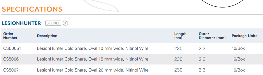 - LesionHunter™ Cold Snare features a rotatable thin Nitinol wire which maintains the oval shape cut after cut. With this cold snare, you get a clean and precise cut.
