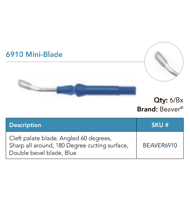 Visitec BEAVER6910 Grindless Beaver® Mini-Blades, Cleft palate blade, Angled 60 degrees, Sharp all around, 180 Degree cutting surface, Double bevel blade, Blue, Box of 06